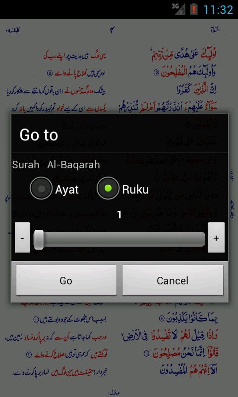 - Jump to any ayat or Ruku of a Surah