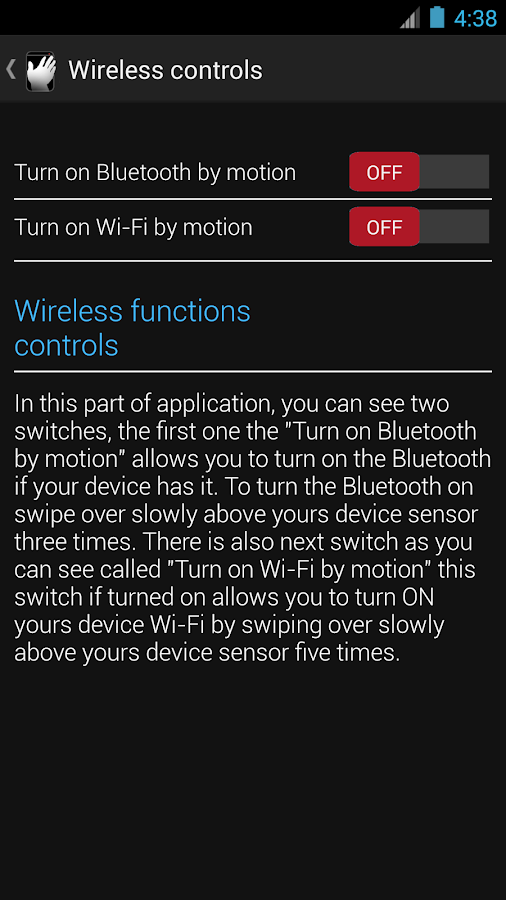 -Wireless controls - Bluetooth, Wi-Fi, can be now turned OFF or ON by simple motions.