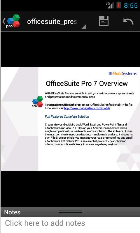 Made by MobiSystems, OfficeSuite Pro allows you to view, create, edit, print and share Microsoft Word, Excel and PowerPoint files on the go. You can also open attachments and see PDF files on an Android based phone or tablet with our feature-rich mobile office solution.