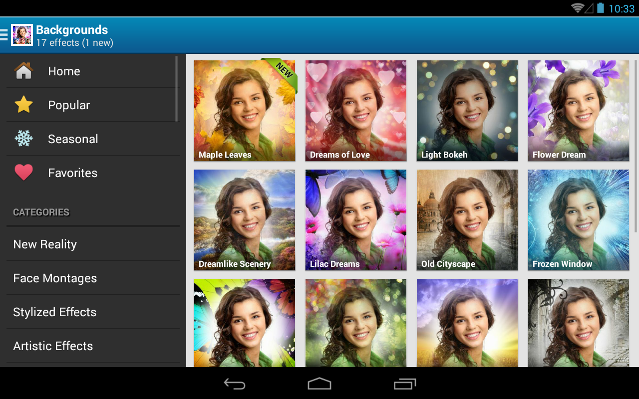 - background effects to change surrounding of your photo into a dreamlike scenery or delicate wings of tropical butterflies.