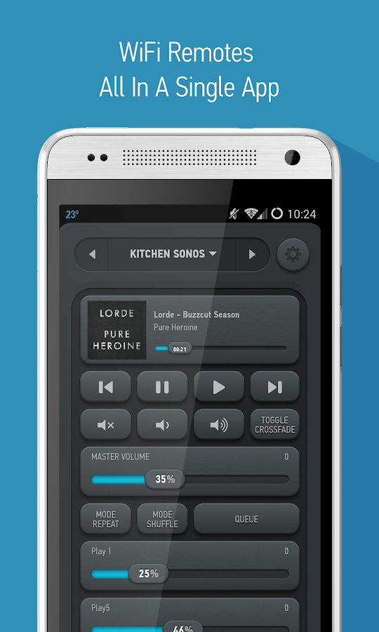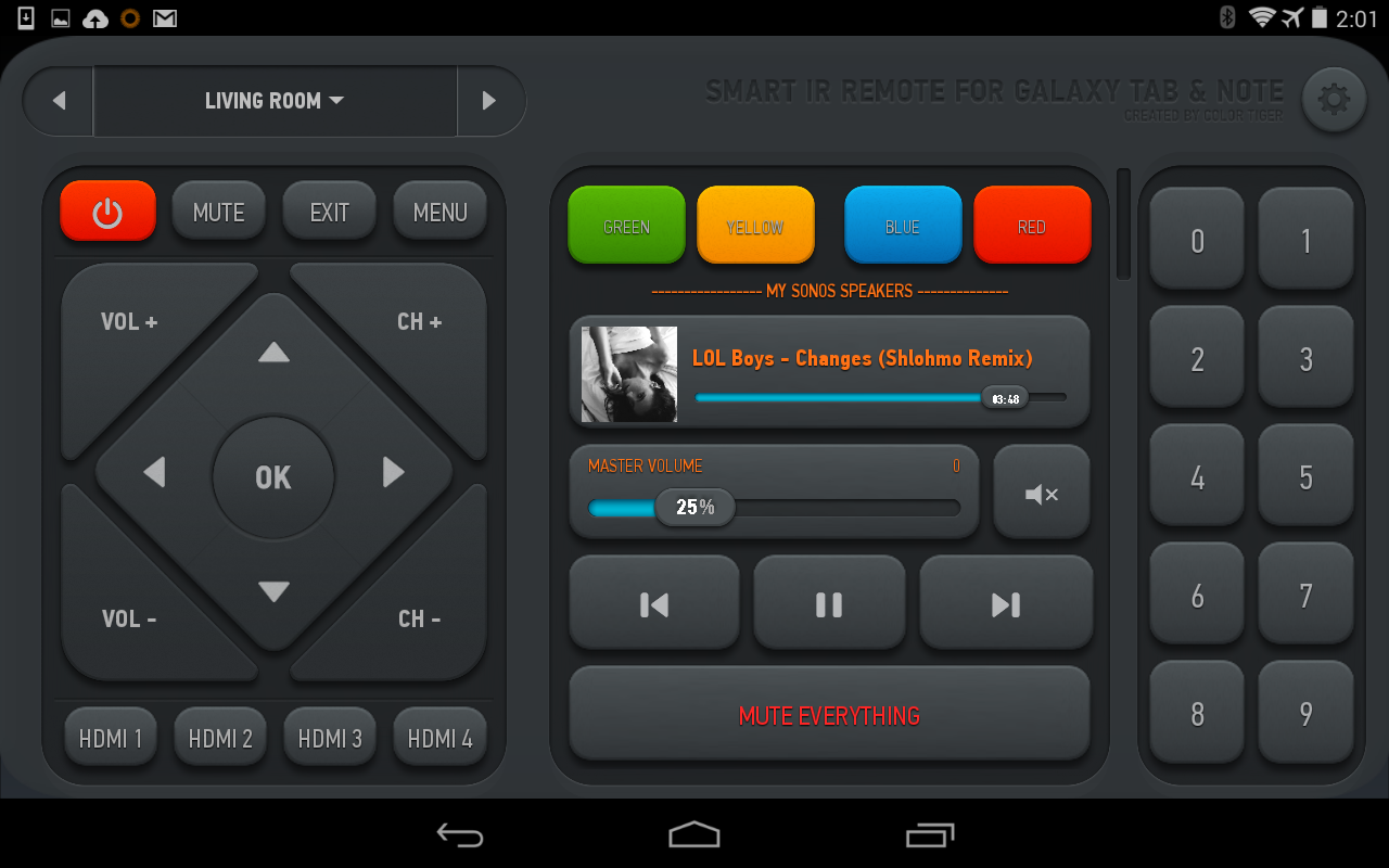 Smart IR Remote is an universal smart remote control that can command almost anything that receives InfraRed commands, like a TV, Set Top Box (cable and satellite box), DVD, BluRay player, VCR, Amplifier, Air Conditioner, AV Receiver, DSLR camera, etc. Better yet, you can combine your remotes into smart remotes (activities) so that on your custom remote you'll have the volume buttons to your surround system, the channel buttons to control your set top box and the display buttons to control your TV. It's the only Android universal tv remote that can do that, while controlling any other device too!